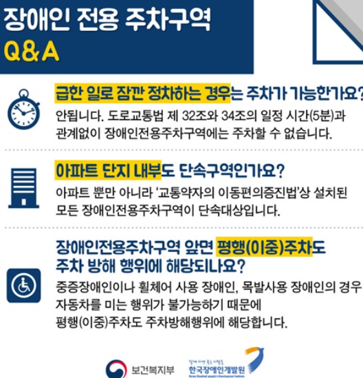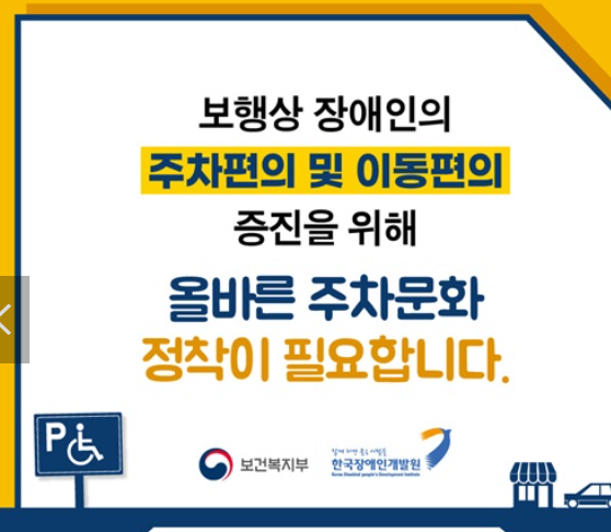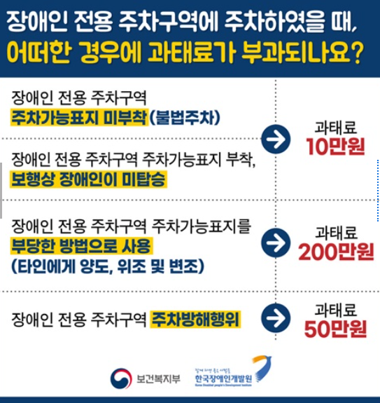 - 장애인 전용 주차구역 주차 방해 행위 50만원의 과태료가 부과됩니다.