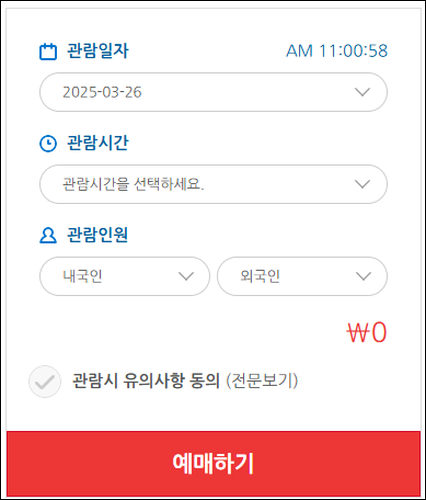 - 외국인 전용 시간 후원 외국인 관람 시간에는 내국인의 예약이 제한되며, 외국인 동반자의 경우에만 내국인 2명까지 함께 입장이 가능합니다.