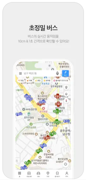 - 초정밀 버스 위치 서비스 부산, 광주, 울산, 제주 등 일부 도시에 한해 제공되는 기능으로, 보다 정확한 대중교통 정보를 제공합니다.